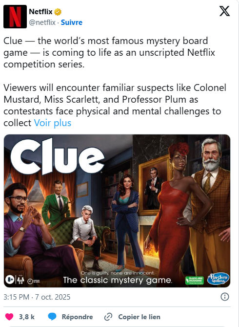 Le géant du streaming vient de donner son feu vert à l'adaptation du jeu Cluedo, et veut en faire sa prochaine émission de télé-réalité dans la veine de Les Traitres.